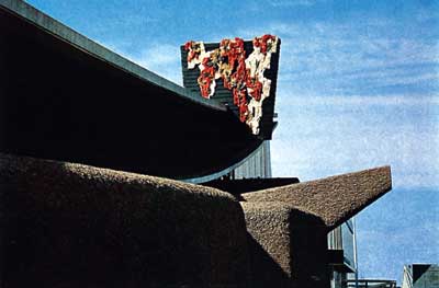 A white smooth wing with a double curvature emerges from an articulated building base of rough concrete finish. On top of it stand out as metaphysical elements the spherical bronze Globe by Arnaldo Pomodoro, the Ceramic Flag of Leoncillo and the metallic composition of Cosimo Carlucci. The Pavilion was divided into three areas: "Poetry and Values of the Past", by Carlo Scarpa; "Costumes and Men's Earth", by Lorenzo Ricci; "Industry and Design", by Bruno Munari. With an architectural language in contrast one to the other, the three areas were connected by an internal route animated with light projections by Emilio Vedova.